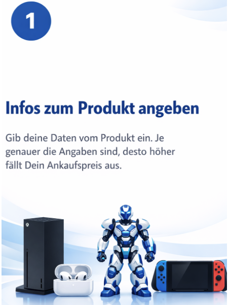 Produktinformation: Gib die Details des Produkts an, das Du verkaufen möchten (z. B. Marke, Modell, EAN, Zustand) - einfach auf unseren "VERKAUFEN" Button klicken.